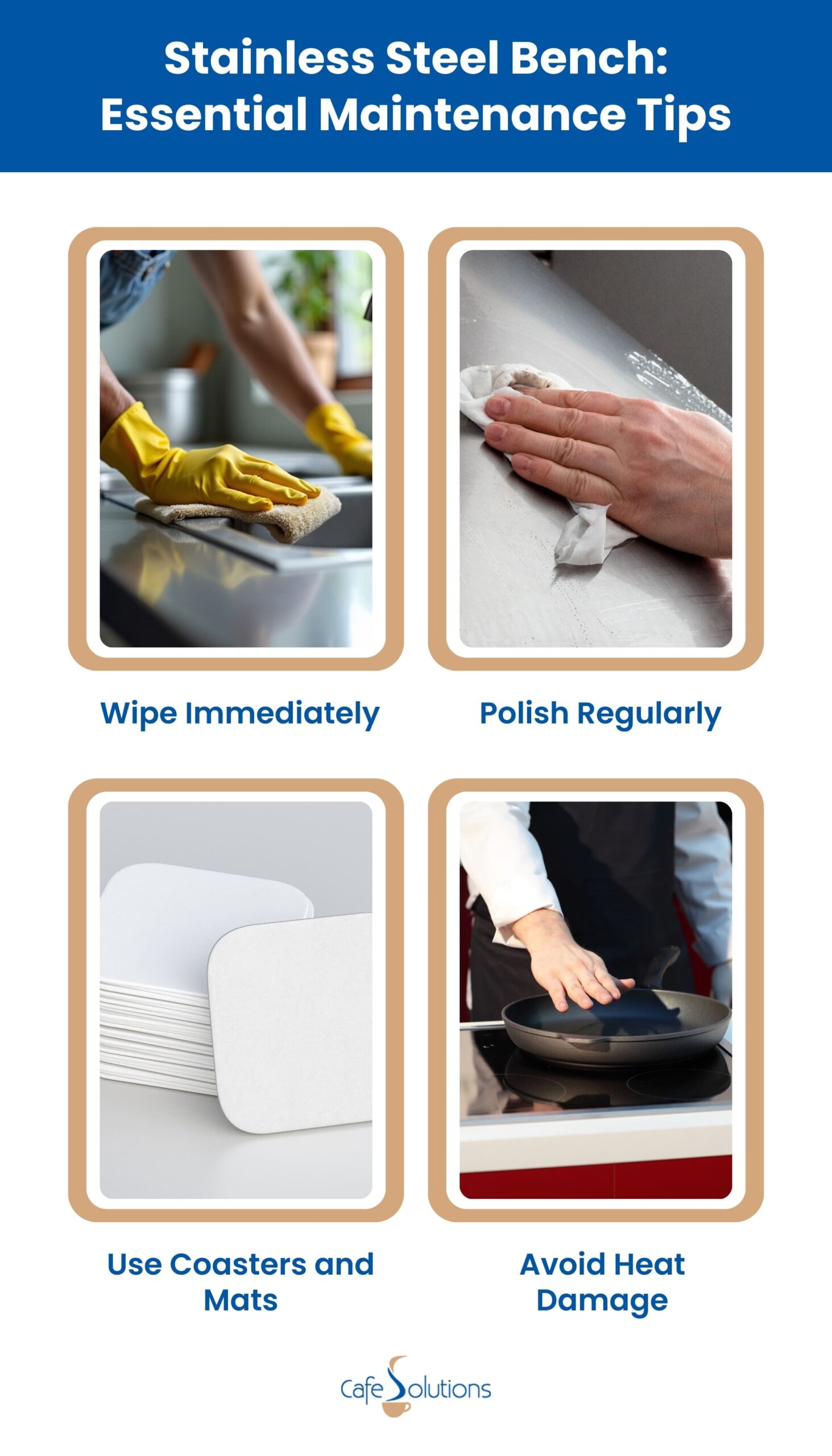 Now that you know the best way to clean your stainless steel bench, let’s talk about regular maintenance. Here are a few maintenance tips from the experts at Cafe Solutions to get you started: