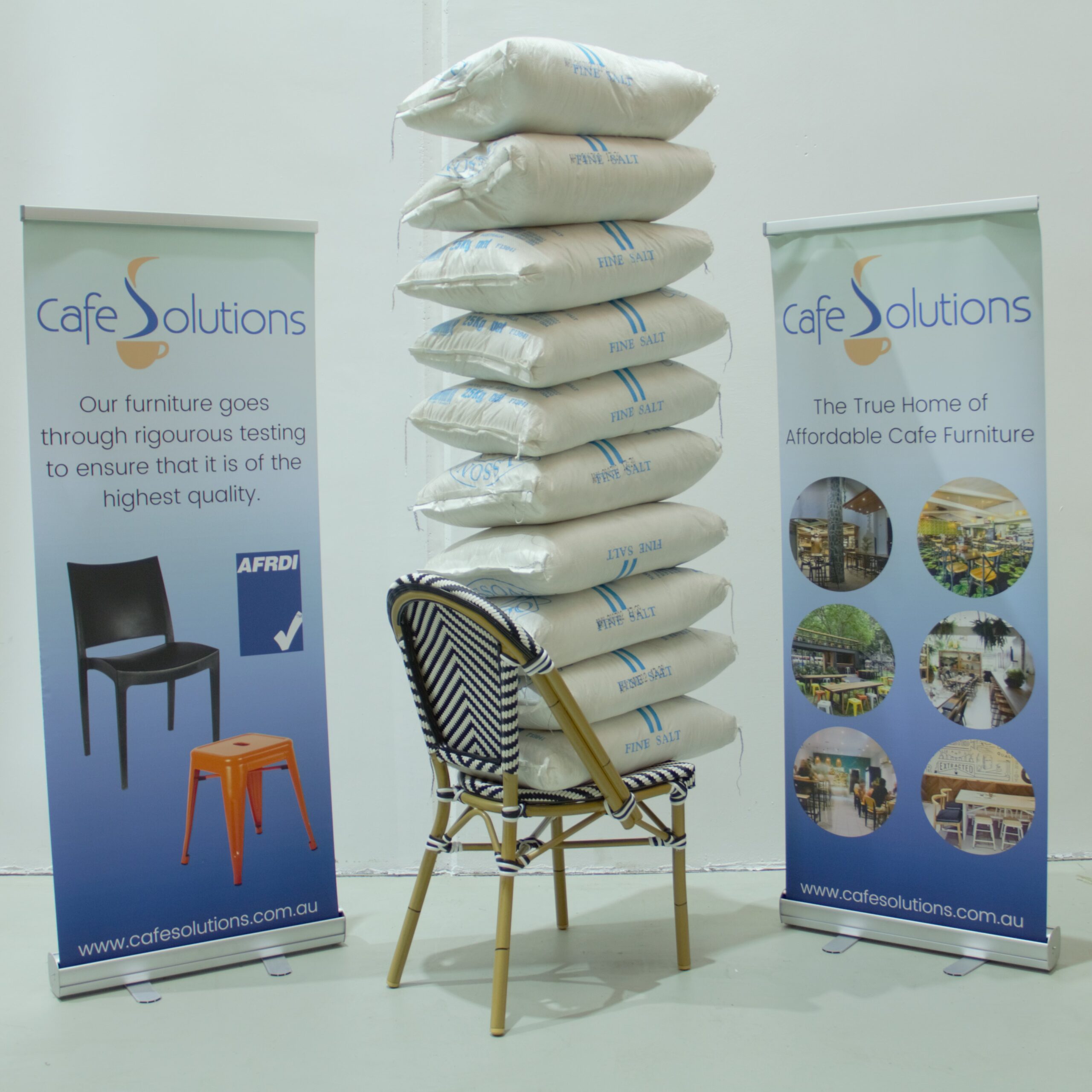 FEATURES Material Welded aluminium frame 8x8mm weave texteline Finish n/a Indoor/Outdoor Indoor or Outdoor Use Needs Assembly No Dimensions D 525mm x W 410mm x H 880mm Floor to seat: 455mm Weight: 3.1kg Stackable Yes Quality Commercial grade Warranty 12 month Other Features Light weight Elastic under seat for added strength and support Static Seat Load…