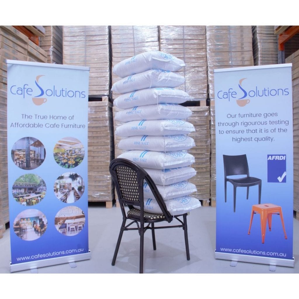 Features Material Welded aluminium frame Flat braided nylon wicker seat and back Finish n/a Indoor/Outdoor Indoor or Outdoor Use Needs Assembly No Dimensions D 520mm x H 880mm x W 425mm Floor to seat: 455mm Weight: 3.3kg Stackable Yes Quality Commercial grade Warranty 12 month Other Features Light weight Elastic under seat for added strength and…