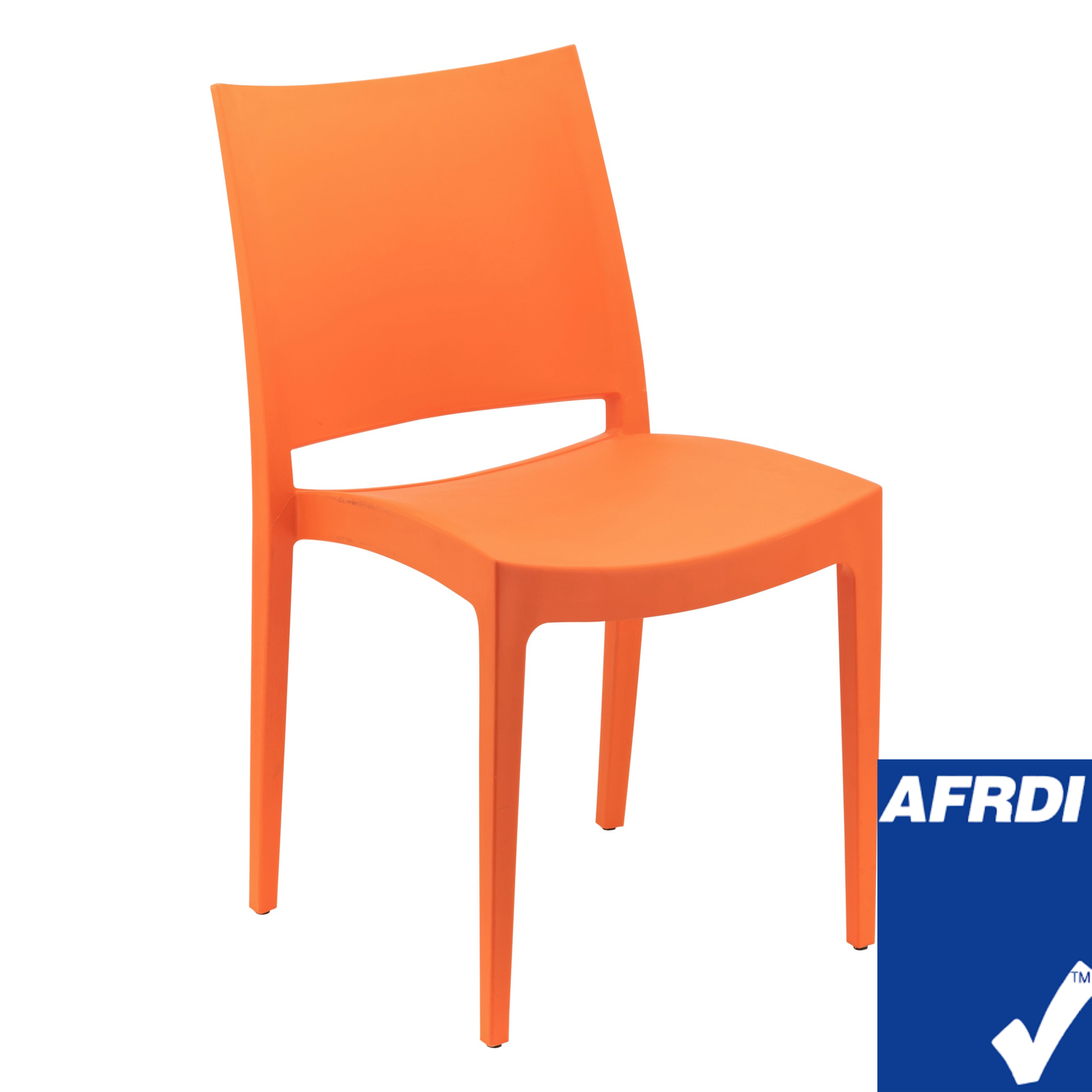 Our orange Specta chairs also work well outdoors especially with light beechwood and aluminium tables to create a look that could transport you to Tuscany or southern Spain. Group your chairs around circular or square tables and dot some containers full of plants in between. Add some parasols to offer some welcoming shade and customers will love it. For a look that really stands out from the crowd on a pavement setting, why not use orange chairs around gleaming black table tops. Throw in some colourful cushions and passers-by will easily be tempted to sit and pull up a seat.