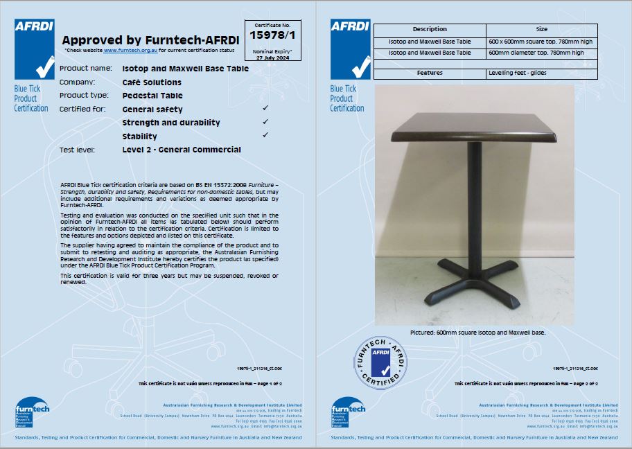 How do I assemble my tables? First, assemble your table base. We have embedded assembly videos for each table base on the relevant product page. Then, attach your table top to the table base. An instructional video on how to do this is available here. This table has been tested to BS EN 15372:2008 – Furniture – Strength, durability and safety requirements for non-domestic tables at test level 2- general commercial. View the certificate here.