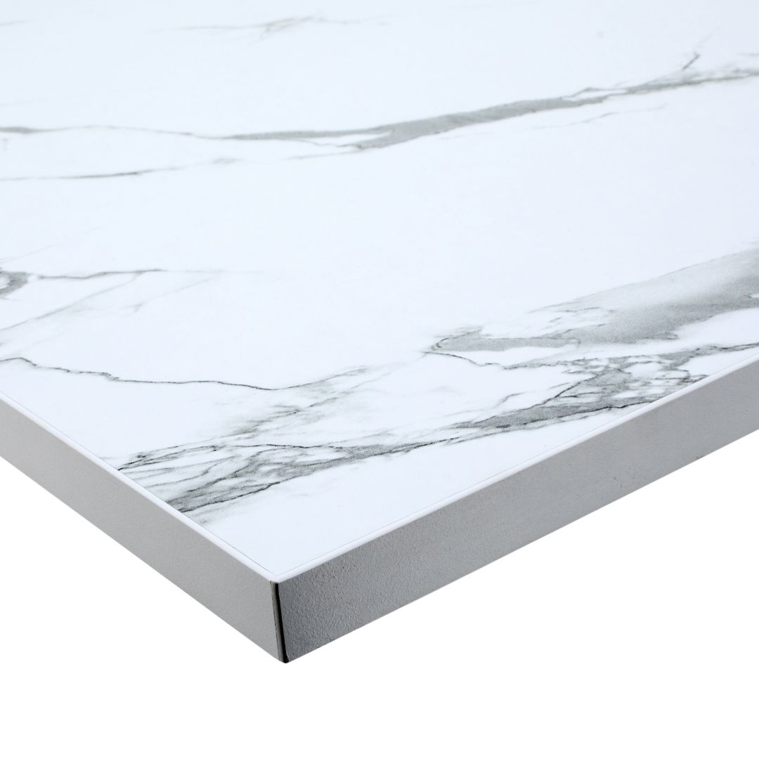 Features Material Melamine veneer, partial board core board with White PVC edge Finish Mercutio Marble Melamine Veneer **Please note Print may vary Dimensions 800mm x 800mm Square 25mm thickness Weight: 11kg Predrilled holes Predrilled holes included for Maxwell, Circular and Chicago bases. For Roma please use self tapping screws provided Indoor or Outdoor…