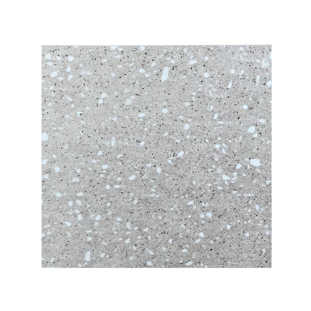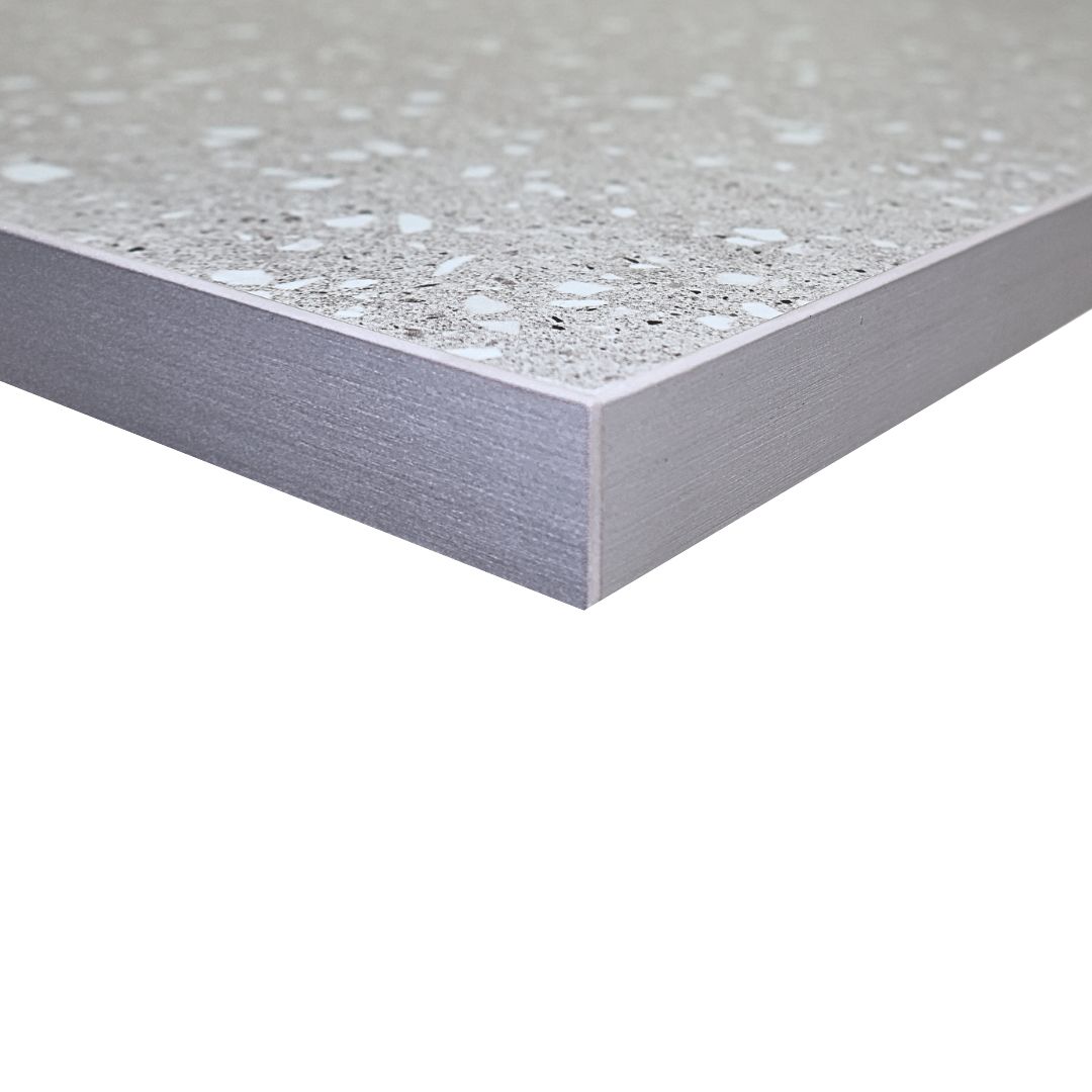 Features Material Melamine veneer, partial board core board with Silver PVC edge Finish Terrazzo Melamine Veneer **Please note Print may vary Dimensions 600mm x 600mm Square 25mm thickness Weight: 6kg Predrilled holes Predrilled holes included for Maxwell, Circular and Chicago bases. For Roma please use self tapping screws provided Indoor or Outdoor Indoor Only…
