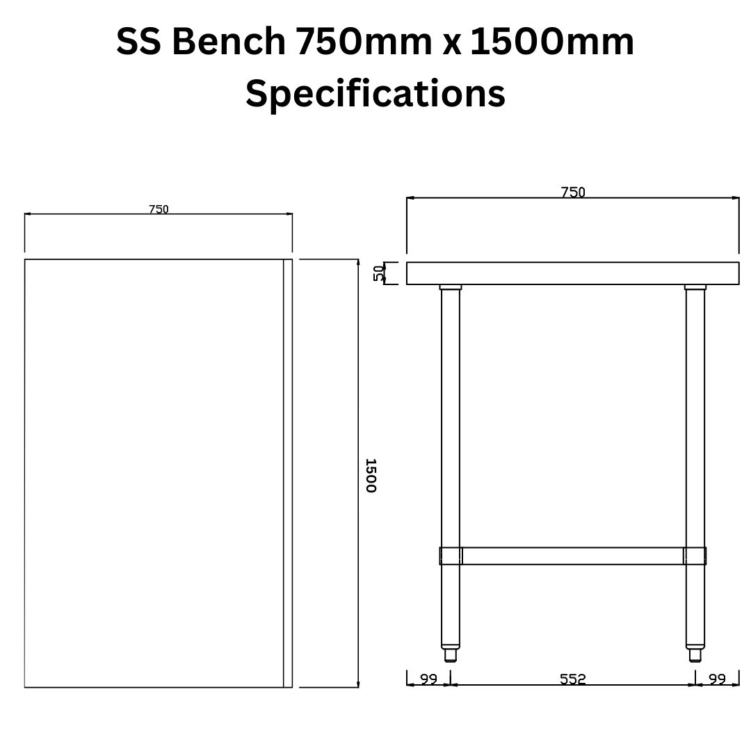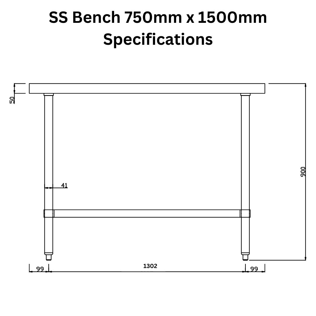 Our stainless steel bench 750 x 1500mm is of quality grade 304 stainless steel and has a galvanised under shelf. This exceptional heavy-duty stainless steel bench comes with unique dimensions; its length is 1500mm, height is 900mm, and width is 750mm.